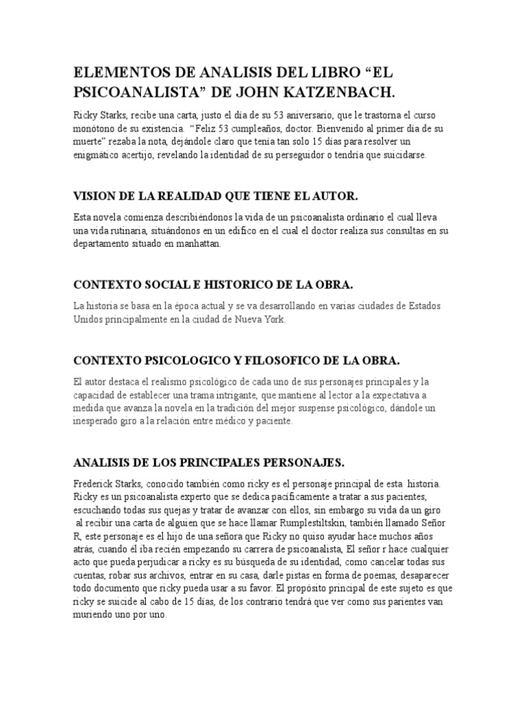 El doctor frederick starks, un hombre dedicado profesionalmente a la introspección, vivía solo, perseguido por los recuerdos de otras personas. Y también este libro fue escrito por un escritor de libros que se considera popular hoy en día. Bienvenido al primer día de su muerte. Arruinó mi vida.y ahora estoy decidido a arruinar la suya. El psicoanalista john katzenbach descargar pdf. Click aquí this was the first katzenbach book i read and it was really good. Estamos interesados en hacer de este libro libro el psicoanalista pdf uno de los libros destacados porque este libro tiene cosas interesantes y puede ser útil para la mayoría de las personas. I never heard of this author prior reading this novel but it was a birthday present and the premise looked really interesting: Quien, se ve obligado a actuar con rapidez para descubrir la identidad del emisor de la carta. Entre y conozca nuestras increíbles ofertas y promociones. Libro el psicoanalista pdf google drive es uno de los libros de ccc revisados aquí. 35 full pdfs related to this paper. De no conseguirlo, deberá elegir entre suicidarse o ser testigo de.